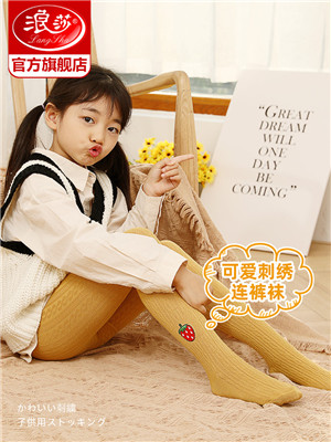 浪莎兒童連褲襪秋冬季女童刺繡草莓打底襪寶寶糖果色麻花條紋襪子